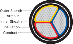 3 cores AL / CU conductor, XLPE insulated, galvanised steel strip / wire armoured cables as per IS 7098 Part – 1.